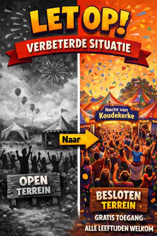 Let op: Door het grote succes en populariteit van N8vK, hebben we geconstateerd dat professionalisering nodig is om te zorgen dat het een gemoedelijk en veilig evenement blijft. Voorop staat dat het voor iedereen gratis toegankelijk blijft. Wel hebben we de keuze gemaakt om op de Nacht van Koudekerke met een besloten terrein te werken. Als bezoeker betekent dit dat het terrein enkel via de in-/uitgang ter hoogte van Zuss&Coffee te betreden is.